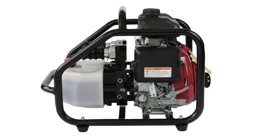 油圧出力カップラーを2口装備しており、同時に使用することができます。大容量の作動油タンクを採用していることから、2口使用でも最大出力で作業ができます。エンジン本体はホンダ社製で自動アイドリング機能による省燃費に加え、騒音も68デシベルに抑えられているので救助現場の活動障害になりません。